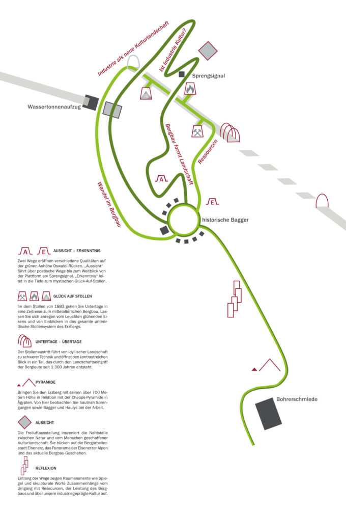 Aufbauend auf Wahrnehmungwerkstätten® wurde schrittweise die Konzeption und Gestaltung einer bergbaulichen Freiluftausstellung entwickelt. Parallel zum aktiven Bergbau der VA-Erzberg besuchen Touristen die beeindruckende Förderanlage und Landschaft. Aufgabe der Gestaltung ist eine Freiluftausstellung, die von den Gästen frei und ohne Gästeführung erlebt werden kann, eine Herausforderung der Planung, um Arbeitsbereiche und Publikumsbereiche optimal zu verzahnen.
