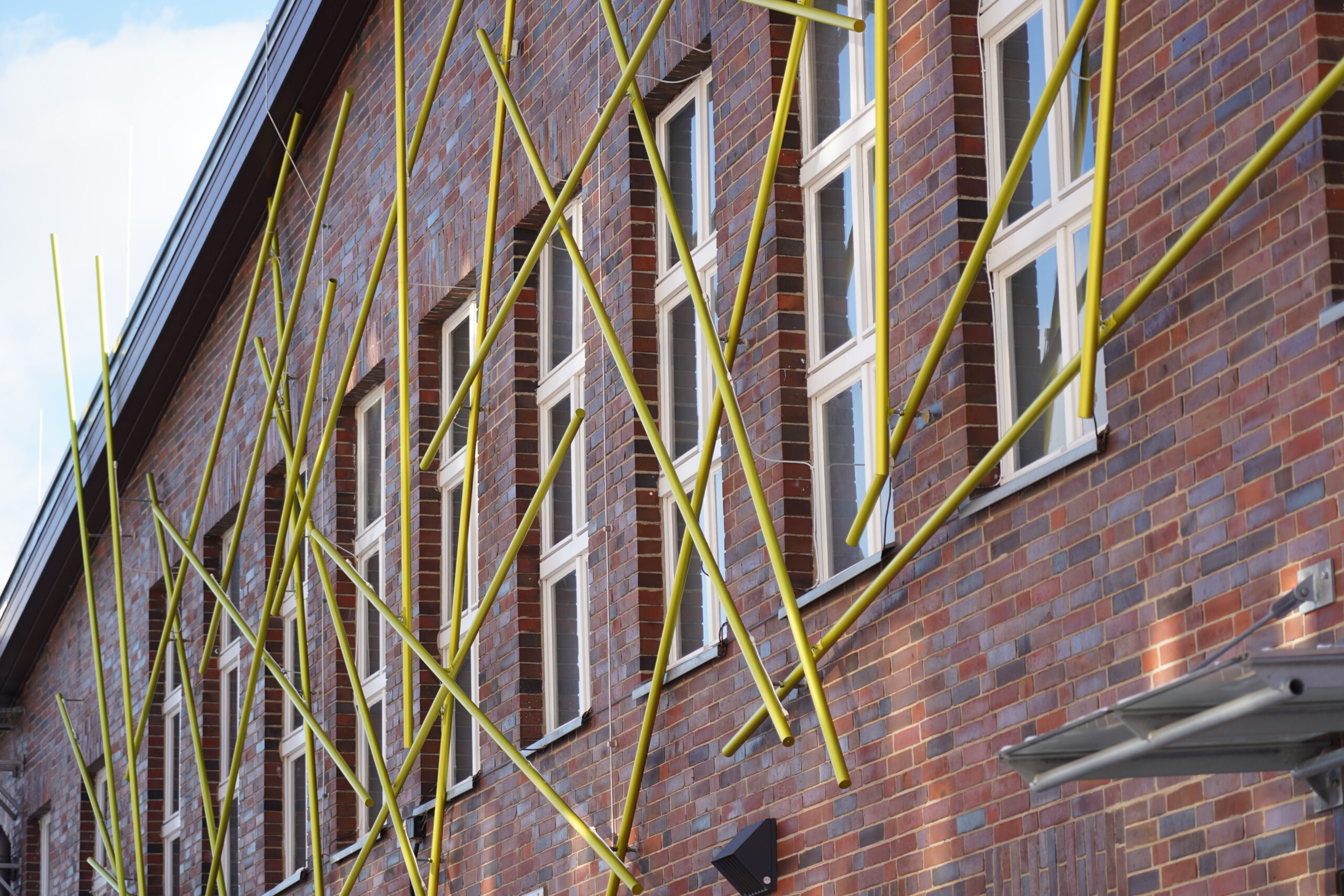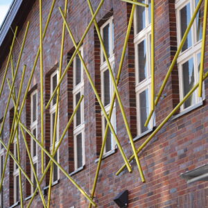 Das Ziel zur Fassadengestaltung der Halle von Motor Sport Babelsberg ist ein weit sichtbares, markantes Zeichen, das einen breiten Interpretationsspielraum und zugleich konkrete Assoziationen zum Thema Sport bietet. Die Installation „Vernetzung“ verbindet in einer direkten Weiterführung die Fassade mit dem Foyer. In dem ausgelobten Wettbewerb wurde der Entwurf 2018 als 1. Platz ausgewählt und anschließend realisiert.